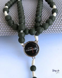 Apresentamos o Terço com a medalha resinada com a imagem de "São Miguel Arcanjo" na frente e a logomarca oficial "Eu Sou Combatente" no verso- pedra emborrachada, número 08mm, na cor verde escuro. Medalha com 2cm de diâmetro.